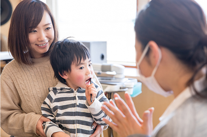 実際に使う器具をお子さんに見せたり触ってもらったりして、「怖い」「痛そう」というイメージとのギャップをなくします。お子さんの様子を見ながら対応します。