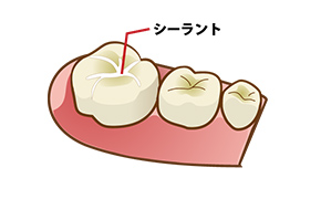 奥歯の上面には深く複雑な溝があり、食べかすが残りやすく、歯みがきだけではむし歯を防ぎきれないことがあります。シーラントは、むし歯になりやすい奥歯の溝を歯科材料で埋め、汚れが入り込まないようにする予防処置です。むし歯のリスクを大幅に減らすことができ、フッ素徐放性の材料により予防効果も高まります。