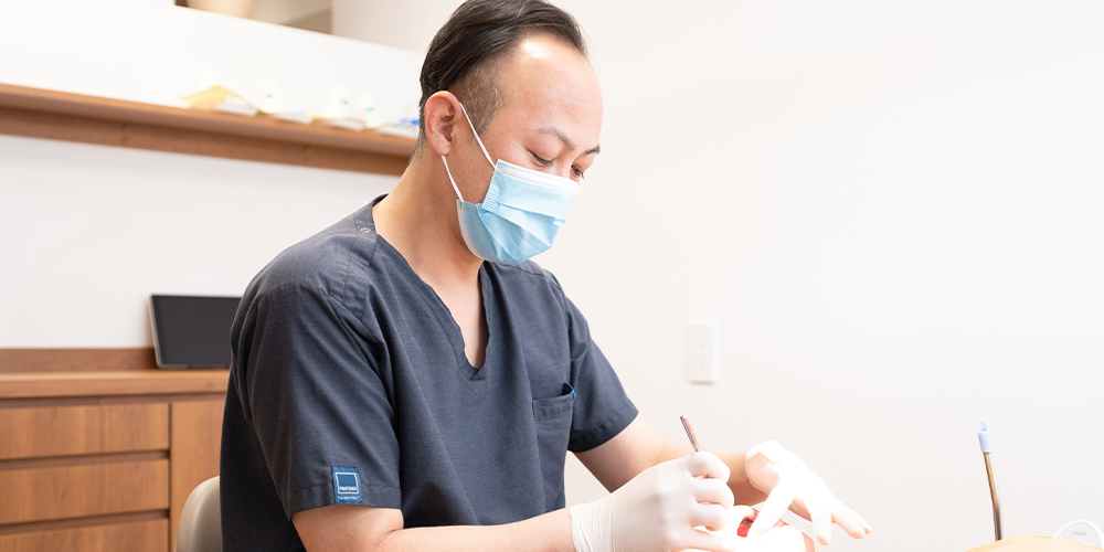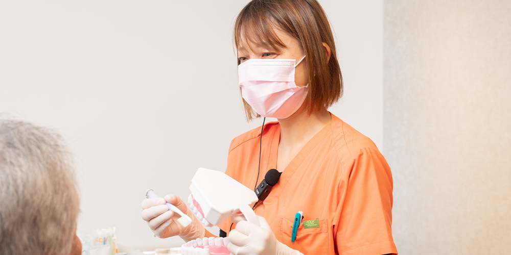 歯ブラシだけでは落とせない汚れを取り除くために、デンタルフロスや歯間ブラシなどの補助清掃用具の使い方をお伝えします。どの道具が合っているかは患者さんによって異なるため、一人ひとりに適したアイテムの選び方や使い方をご提案します。